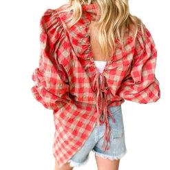Best Sale ⭐ Fate 👩 women Plaid Tie Back Tunic in Red 🔥