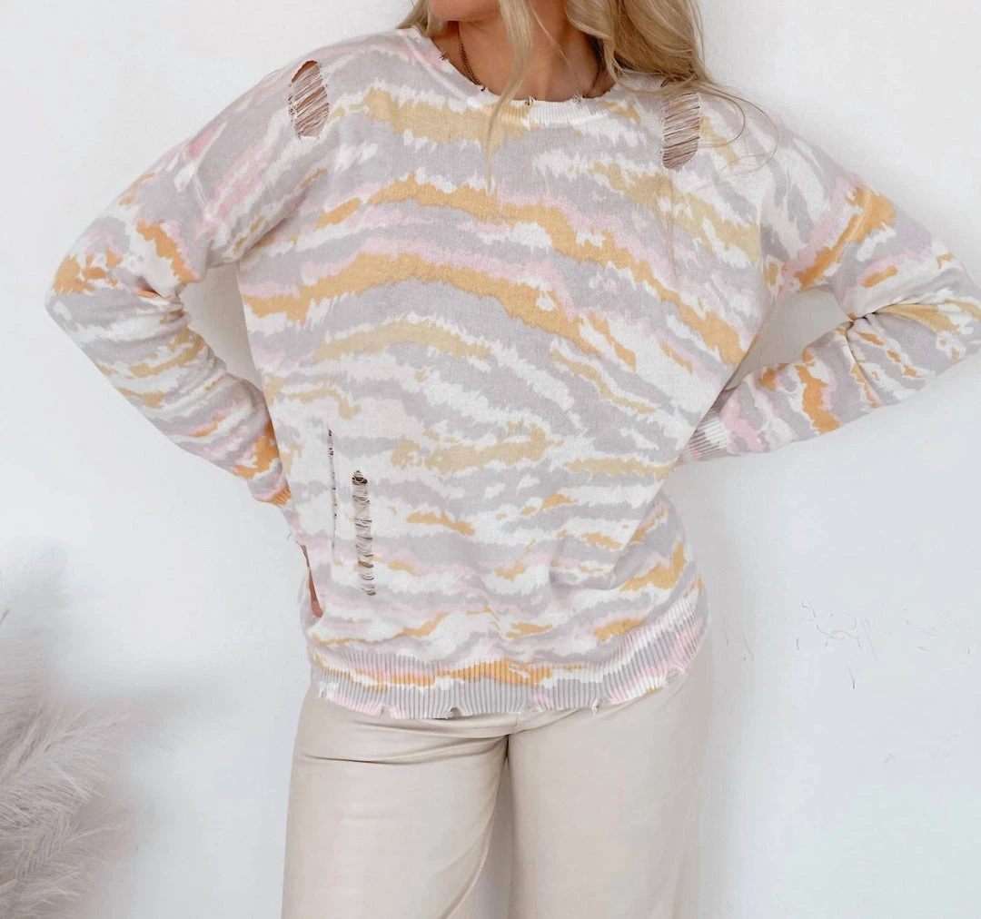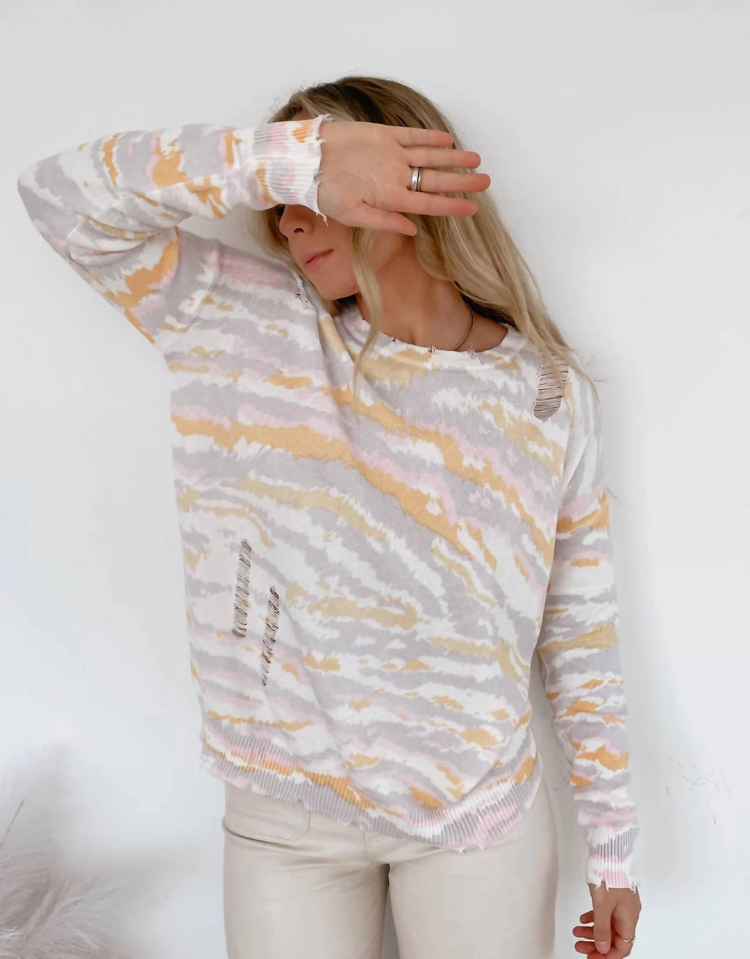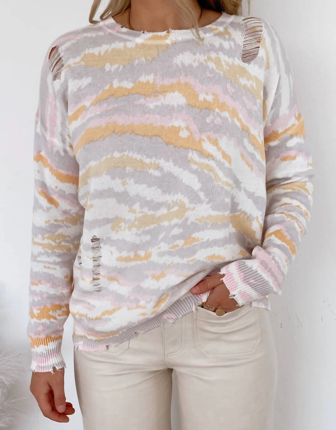 Distressed accents at the round neckline, hem, and cuffs of the long sleeves.