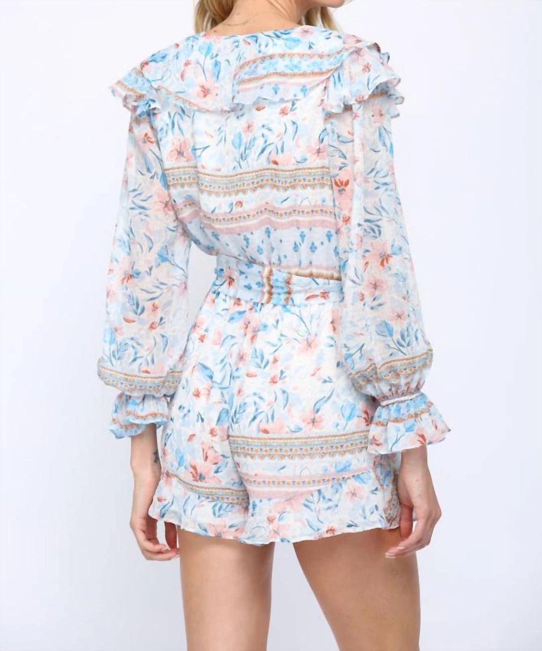 Wholesale โจ Fate ๐ฉ women Floral Print Ruffle Romper in Blue Multi โ