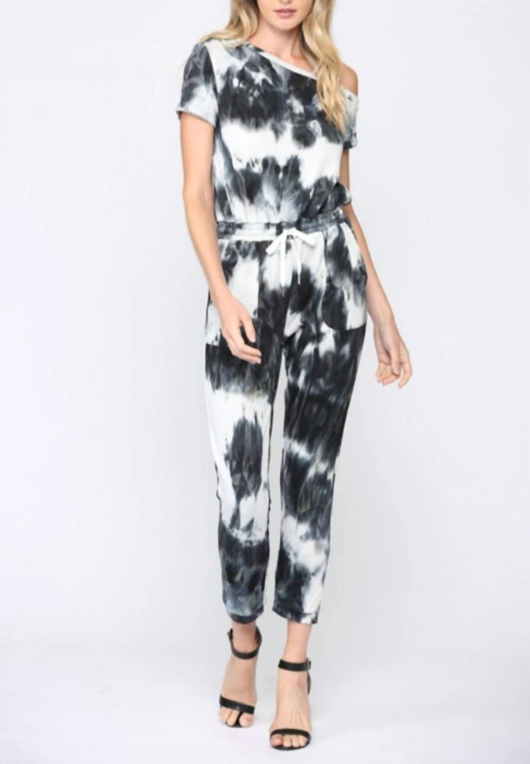 This tie dye jumpsuit features a one shoulder detail, an elastic waist band with drawstring and side pockets. We love this jumpsuit for a night out or to wear casually.