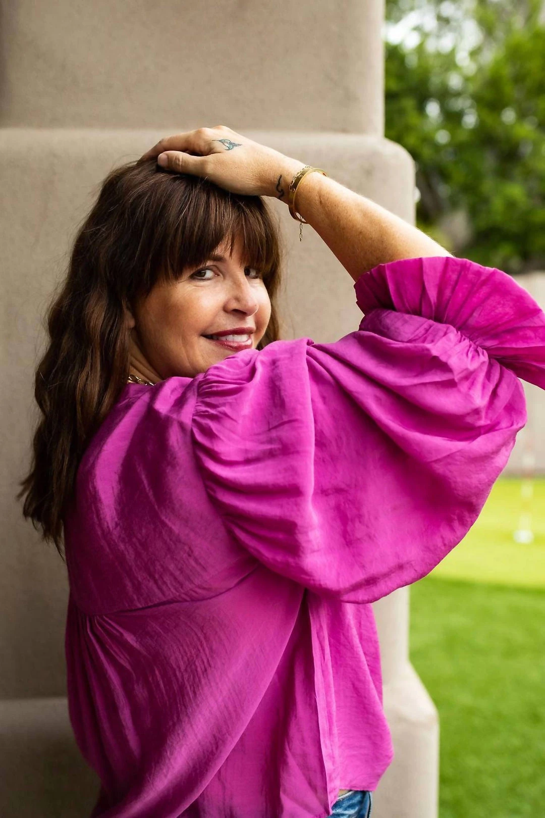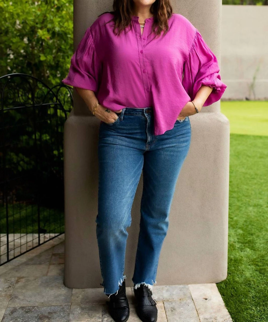 Buttons down the front and no collar.ΓΒ Sleeves are 3/4 length and full with elastic around the arm and a flirty ruffle detail.ΓΒ The front of the blouse is double layeredHand wash cold, line dry.Kim is wearing a large in the magenta puff sleeve blouse